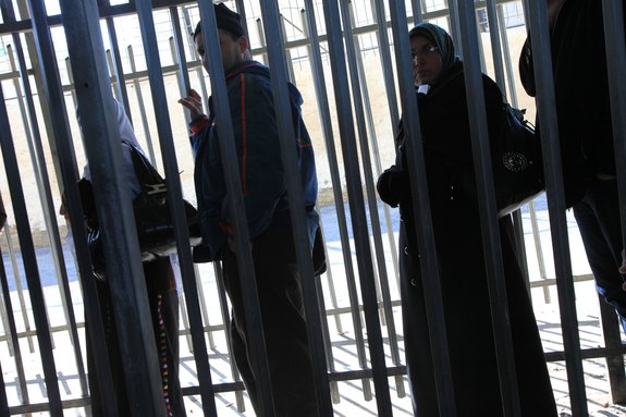 ▲分離の壁の検問所で、通過の許可を待つパレスチナの人々