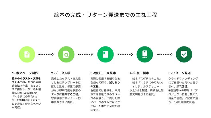 この絵本制作が実現した背景には、クラウドファンディングを通して応援のきもちを送って下さったり支援にご協力いただいた沢山の方々の存在があります。皆さまには遅くとも6月上旬には完成した絵本を手に取っていただけるよう、当初の予定通り5月下旬の発送を目指して水面下で制作を推し進めています。