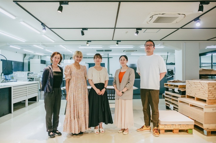 (左から、写真・映像デザイナーの野中さん、絵本作家のまるささん、原案であり作の一部を担当する人見、創業100年を超える印刷会社である加藤文明社の村上さん・三河さん)