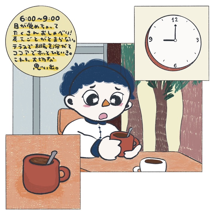 『みんなのいえ』という絵本を制作するにあたって、絵本作家のまるささんと一緒に実際に自立援助ホームみんなのいえに伺い取材を行いました。上のイラストは、その際に職員さんから伺った「他に子どもたちが居ない朝、自分に自信がない事や将来への不安を吐き出してくれた時」の話をもとにしたエピソードです。