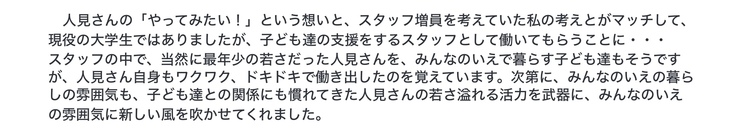大学進学を機に上京し、学業のかたわら、千葉県市原市にある自立援助ホームみんなのいえで約2年間「ひとみん」として職員をしていました。