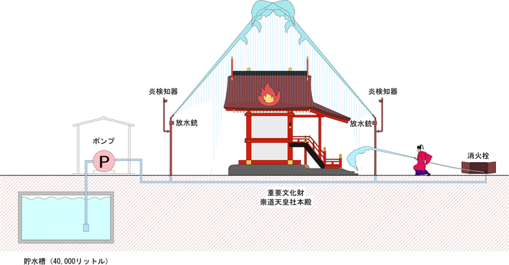重要文化財の防災設備には、貯水槽、放水銃や消火栓、火災を感知したら自動で水が噴き出して建物を被膜する設備、敷地全域に水を送り出すポンプや動力、放火防止のための防犯カメラなど様々ありますが、大規模な工事を伴い、日々のメンテナンスにもお金がかかる高額な設備ばかりです。