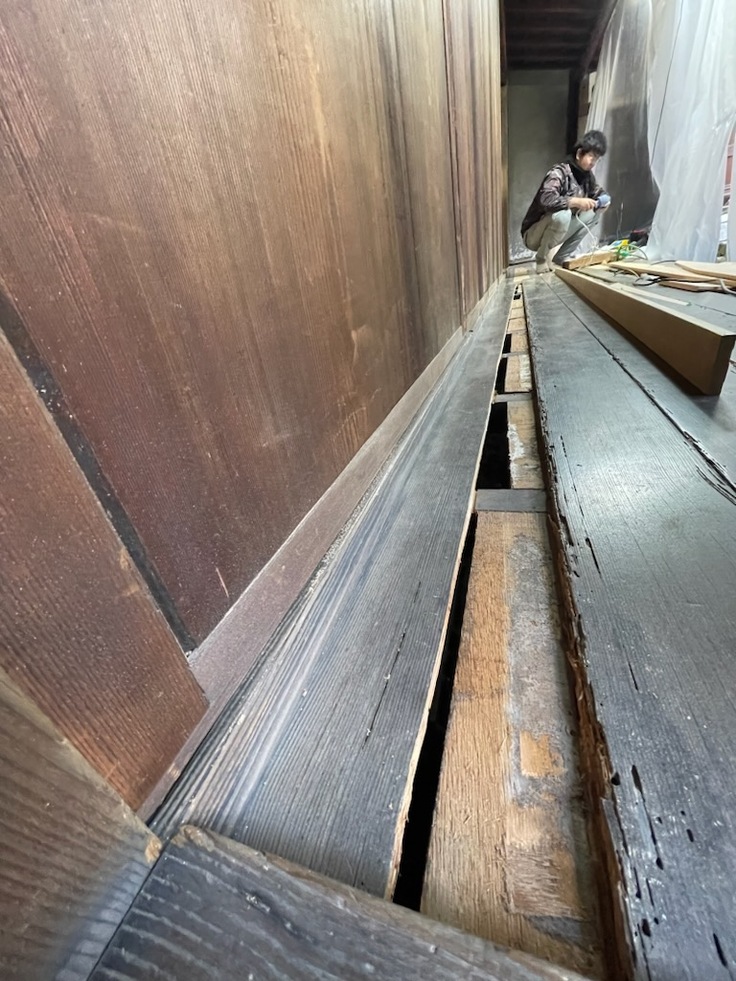 第二期の工事は本日も邸内の各所で進められています。座敷庭の縁は、白蟻の被害で凸凹に喰われ、今月中はその補修を行っています。傷んだ箇所を取り除き新材で『埋め木』するのが木造建築でよくみられる修繕の方法です。こうした細部の【つづくろい】にも費用がかかります。これまで、そしてこれからのおひとりおひとりのお力添えが京町家杉本家住宅の継承に活かされます。主屋の母屋と店の間の大屋根にはご支援くださった新瓦も葺かれ、この先ずっと杉本家住宅を守り続けます!ひきつづきよろしくお願いします!!