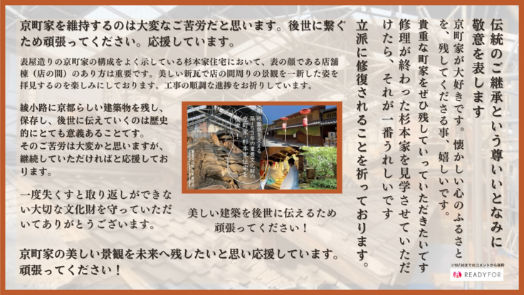 庭の柿が実る京町家。この家が建てられた時に植えられた木。150年余の杉本家のひとびとの歴史をみつめてきました。令和3年秋からはじまった大屋根葺き替え大修理、それに向き合うわたしたちの姿をじっとみてくれました。クラウドファンディングへご支援くださったたくさんのみなさまの後押し、あたたかなメッセージをこの木に語りかけながらここまでの日々を過ごしてきました。「こんなぎょうさんのかたから、うちとこの家とこの工事は見守られてるねんよ。ほんまにありがたいことやなぁ。この大工事を無事に終われるよう、みなさんからのご支援に応えられるよう、がんばりましょな。」あと数日になった今回のプロジェクト、どうか11月13日(月)午後11時の最後まで、令和の時代の京町家の挑戦にお力添えください。どうぞ宜しくお願い申し上げます。