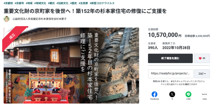 今回のプロジェクトは、9月8日まで引き続きご支援を募ります。目標金額到達後もご支援を引き続きお願いするのは、老朽化している伝統的木造建築の修理は、尽きることがないからです。ひとりでも多くの方々に、京都に京町家が存続することに応援をいただきたく思っています。ご知友など、京都LOVERの方々に、このプロジェクトと杉本家住宅の活動をおひろめいただけましたらありがたく思います。ご支援のお志を大切に修理工事に充てさせていただきます。どうぞ宜しくお願いします。