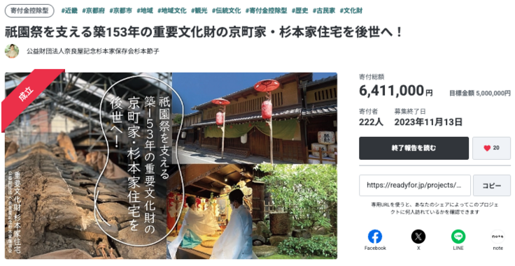 祇園祭の山鉾町最大規模の町家遺構である杉本家の住宅とその環境を保存公開するため同家のみなさんが総出で、さまざまな年中行事を欠かさず丁寧に取り行われる姿勢は、大切な文化財としての家屋、庭、その佇まいに加え、それらが記憶するインテリジェンスとも言うべきものが継承されることを願っての活動であり、この点を大いにご理解賜った上で、篤いご支援をいただきたいと存知ます。