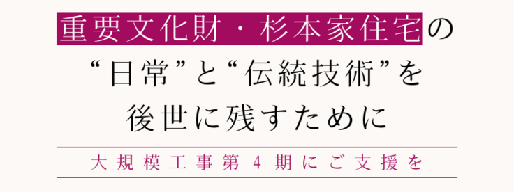 ■プロジェクト終了要項:2026年3月末(予定)までに公益財団法人奈良屋記念杉本家保存会が杉本家住宅の修繕を完了したことを以て、プロジェクトを終了とします。