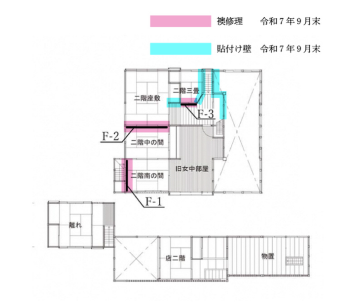 主屋2階は非公開であったこと、令和3年秋から令和6年3月末まで行った主屋屋根瓦の全面葺き替えによる粉塵の影響も考え、今年度の修理となりました。
