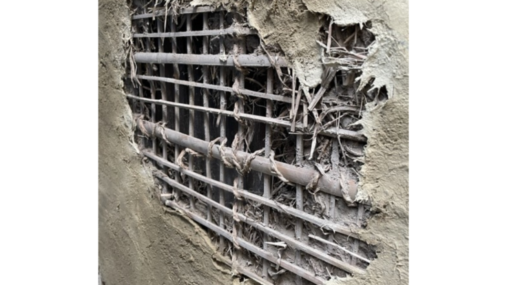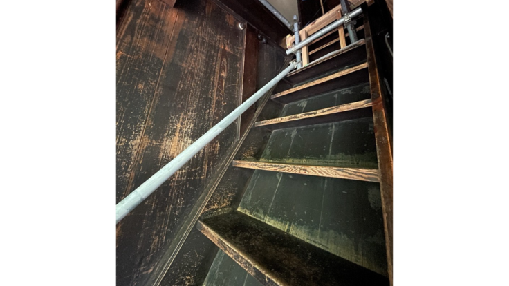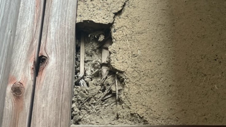 令和3年度から始まった大屋根の全面葺き替えや耐震補強は、令和6年度で一旦完了いたしました。しかし、住宅各所には修理が急がれる損傷がまだまだ多く、やむなく、令和7年度「第4期工事」として延長することにしました。玄関・店庭まわり土間叩き、隅蔵北側高塀、主屋2階座敷襖の修理、階段まわりの貼り壁など、町家の暮らしの美しさを支える箇所の修理に取り組んでいます。