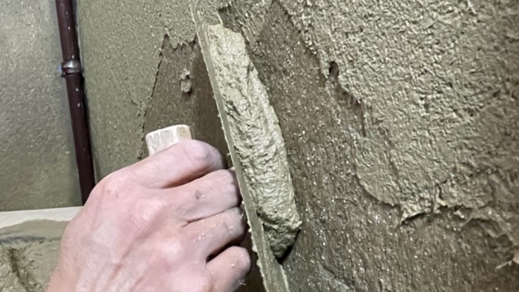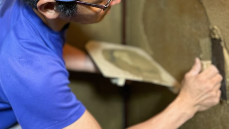 150年を超える年月を経た壁。漆喰や貼付壁のはがれ、傷みを当時の技で丁寧に修復します。