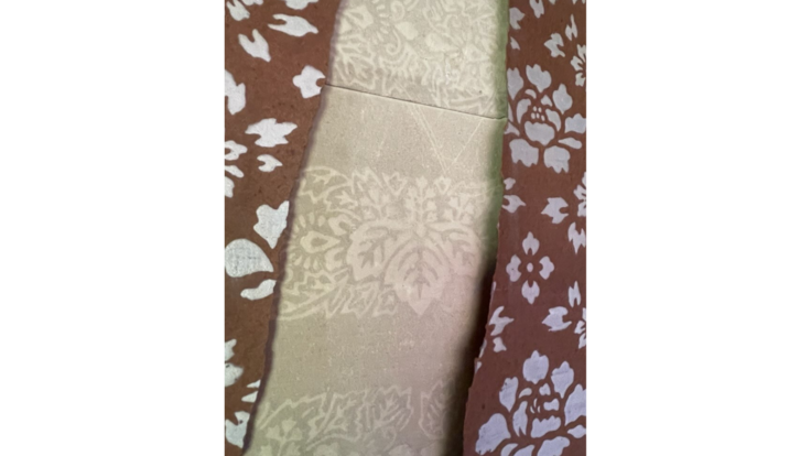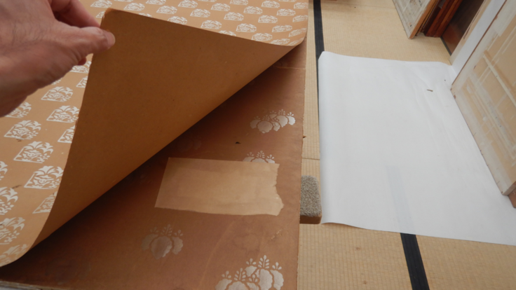 今回の修理で、表面の襖紙を取り除くと、以前に使用されていた唐紙が表れました。文化財修理では原状を重視しますが、以前の襖紙の再現が困難であるため、今回は、その意匠と似通った唐長の唐紙での修理を行います。