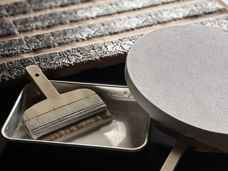 和紙は湿度や温度によって状態が変化するため、その具合をみながら絵具と雲母を溶き合わせ、定型の大きさの紙を十数枚、模様を合わせながら襖下地に貼ってゆく、とても繊細な作業には、長年使い込まれた版木、道具類があってこそ。