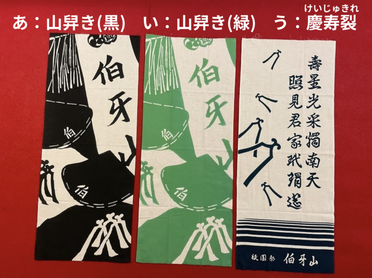 今回はリターン品として伯牙山オリジナル手拭いを3種類ご用意いたしました。いずれも、祇園祭7月14日~16日の3日間のみ伯牙山保存会によって販売される貴重な手拭いです。
