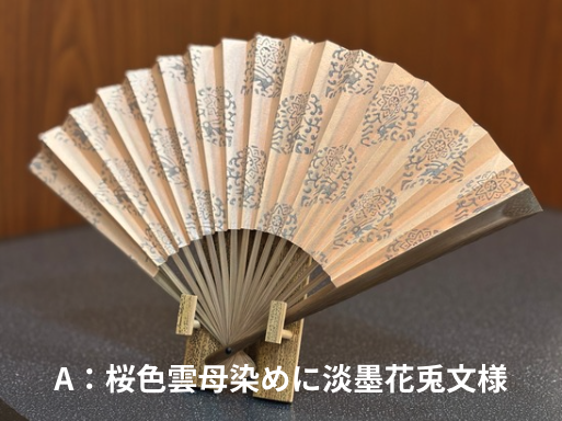 杉本家住宅の襖には正面を向いた兎の市松文様があり、兎文様は先代の杉本家当主も愛したものでした。この扇子の花兎は左右に兎が駆けている様子が愛らしく表現された文様です。