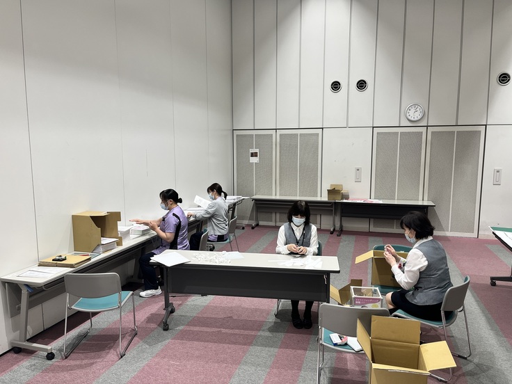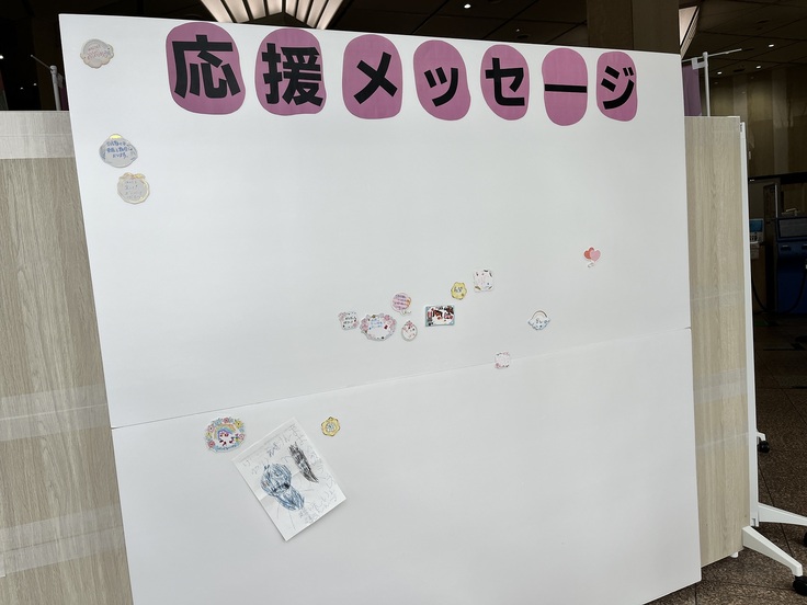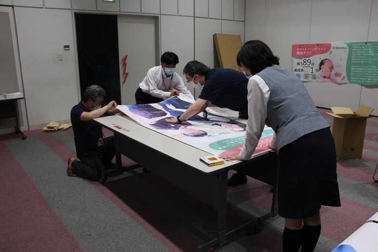 ➀パネル作成(慎重に張り合わせ。隣では、がちゃがちゃのカプセルに御礼メッセージ魂入!)