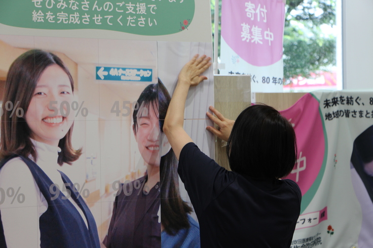 プロジェクトメンバー村上副看護部長が8枚目のパネルをチャレンジボードに貼り付けました。