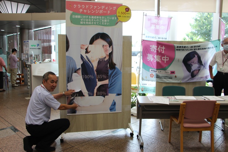 今回は、プロジェクトメンバーの高元事務長に14枚目のパネルをチャレンジボードに貼り付けてもらいました。