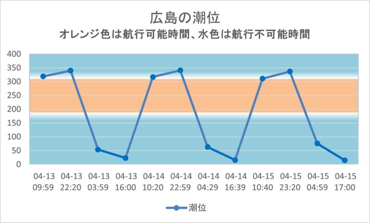 - 干満差が激しい・・・広島の川は瀬戸内海とつながっており、1日に最大3〜4メートルの潮位差が生じます。干潮時には川底が露出する場所もあり、航行可能な時間帯が限られてしまいます。