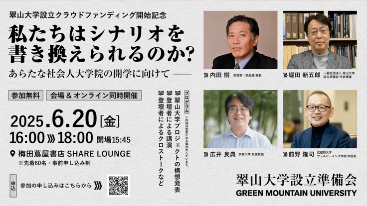 この記事では、6月20日(金)に開催した「翠山大学設立クラウドファンディング開始記念|私たちはシナリオを書き換えられるのか?新たな社会人大学院の開学に向けてー」トークライブの模様を、一部抜粋し複数回に渡ってご紹介します。