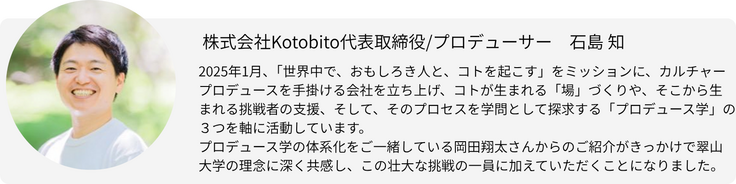 株式会社Kotobito代表取締役/プロデューサーの石島知と申します。この度、翠山大学の中部エリアの地域拠点の立ち上げを担当させていただくことになりました。