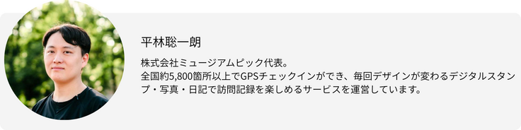 全国5,800箇所以上の博物館(歴史・総合・美術館、動物園、水族館等)をデータベース化し、5,350館超の施設情報を発信する「ミュージアムピック」を開発・運営しています。GPSチェックインとデジタルスタンプで「訪れた記録」を残し、写真と共に日記化して楽しめるサービスです。「博物館を訪問する楽しみを10倍にする」をミッションに、日々全国の博物館・学芸員の皆さまと伴走しています。