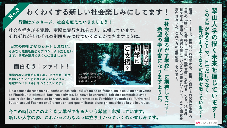 そして何より、既存の社会システムから一歩退いて、自分の人生のための学びを行える学校、そんな学び場を必要としている、望んでいる多くの方の声と共に公共の教育機関として設立できたら・・・。