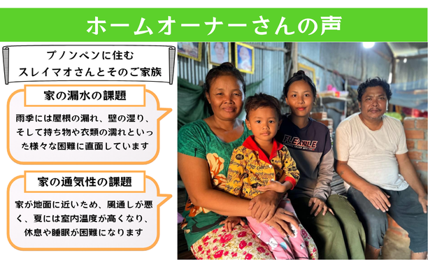 特に問題なのは、雨天時の住環境です。老朽化した屋根から頻繁に雨漏りし、室内に水が入り込むため、壁や床が常に湿っています。衣服や荷物も濡れてしまい、家全体が不衛生で湿っぽい状態になっています。また、暴風雨の際には家が不安定になり、幼い子どもたちの安全が危ぶまれる状況です。加えて、家が地面に近いため、空気の流れが悪く、夏場には室内の温度が異常に高くなります。これにより、家族は昼夜を問わず不快な生活を強いられ、特に夜間には快適な睡眠が取れません。さらに、大雨が降ると1階が浸水し、孫たちの健康と安全にも大きな影響を与えています。家族は水が溜まった家の中をかき分けながら生活し、皮膚に発疹やかゆみが出ることもあります。小さな子どもにとっては、溺れる危険もあるため、ホームオーナーさんは常に子どもたちの安全を心配しています。