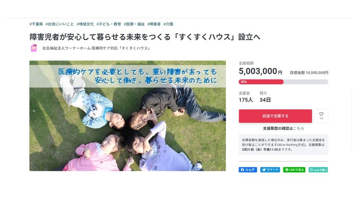 目標まで折り返しですが、引き続きこのプロジェクトを通じて、医療的ケア児やご家族の抱えている課題を知っていただき、みんなが安心して暮らし続ける未来を日本中に広げていくことができるように頑張りたいと思います。