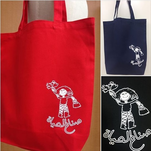 アマルではサブリーンちゃんが描いた素敵な絵を活かすことができればと、パレスチナの友人が好きな言葉「create life」をアラビア語で添えて、トートバッグを作らせて頂きました。