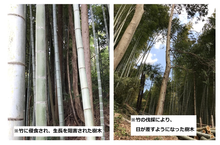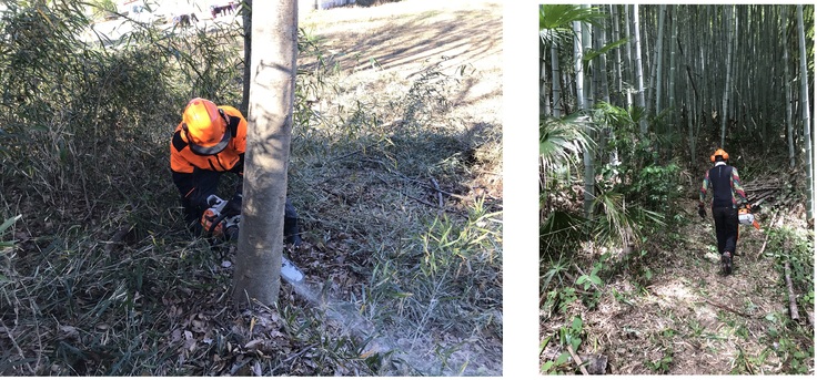 加えて、森林において問題となっているのが竹害です。竹は繁殖力がとても高く、地下茎をどんどん伸ばして周囲の森林に侵食していきます。竹に侵食された森林の樹木は、竹との競争に敗れ、生長が阻害されるだけでなく、枯死していくことも多いのです。炭義.では現在、竹の伐採による森林整備に力を入れており、一日に伐採する量は約400~500㎏になります。