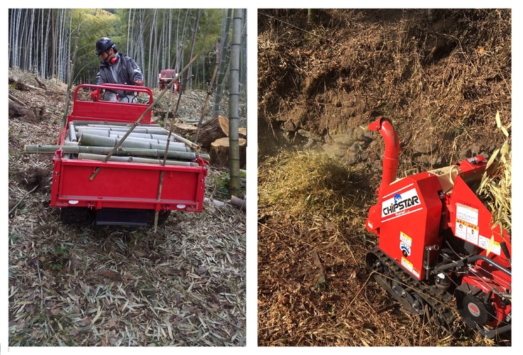間伐は過酷な点が多くあります。伐採した竹や樹木の枝葉はチッパー(粉砕機)にかけ、土に還し、幹は短く玉切りします。そして玉切りした竹や樹木を運搬車で運び出します。