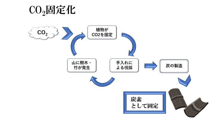 株式会社炭義.にて竹林整備を行い、森林資源を伐採する。これを原料として炭製品を製造する。