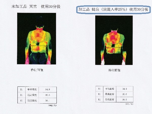 結果は写真でもお分かりの様に右のSUMISENの方が赤い部分が多いです。写真が一枚しか載せられないので、結果及び考察の批評の資料は貼れませんでしたが、『着比べ、使用30分で平均温度は0.5°上昇した。このことから、加工品健泉(炭糸の原糸の事です)の使用は温熱特性に優れているといえる。』という結果を頂きました。