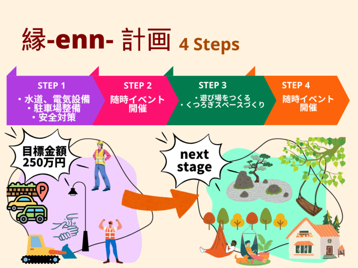 この「縁-enn₋」は私たちだけでなくこのクラウドファンディングを通じて私たちの想いに共感してくれる仲間と出会い、共に楽しむ仲間がいてこそこの場所は本当に生きた空間になります。