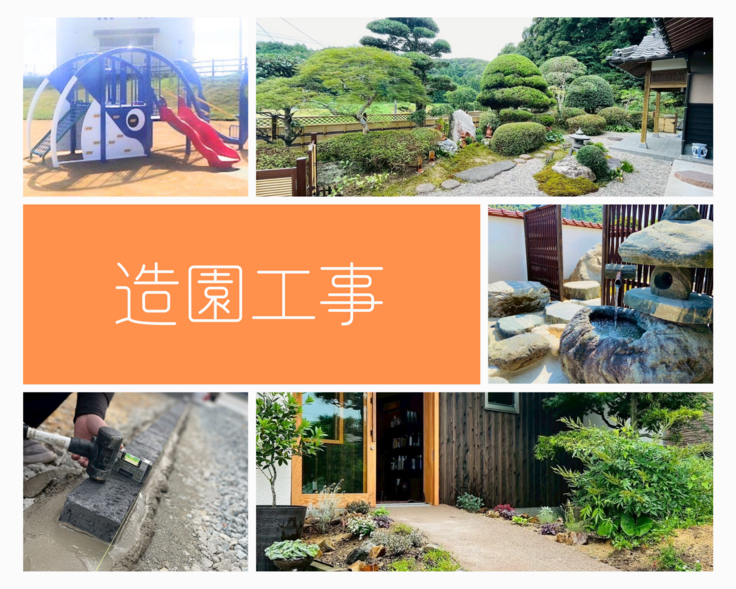 小さな造園会社ではありますが、民間のお庭づくりや外構工事など様々なお客様のご要望にお応えしながら施工を行い、公共工事にも携わり、道路改良工事や、ほ場整備工事、道路の植栽管理を行っております。