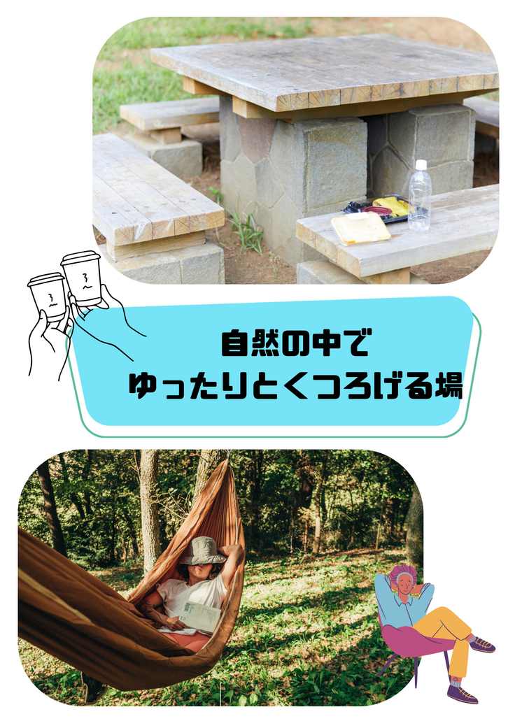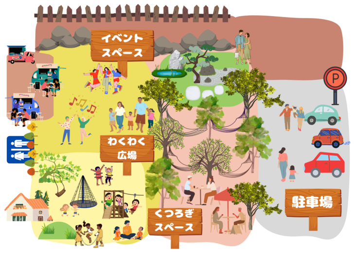 その空間では、誰もが自然の中でのびのびと遊び、癒され子どもから大人まで楽しくつながり、都会ではなかなか体験できない、自然をまるごと楽しめる広場であり、自然素材で作られた遊具や小さなお子様でも安心して遊べる砂場や大人がくつろげるベンチやハンモック、また造園スペース等で五感を刺激し子どもも大人もこころがほどけるヒトトキを過ごせる場を造りたいと思います。