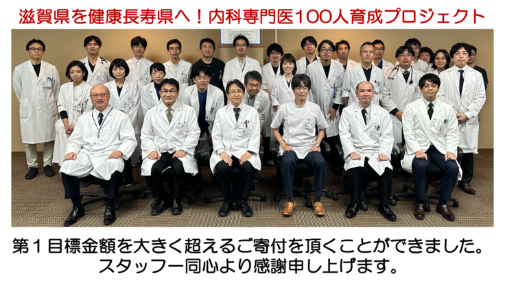 この度の我々のプロジェクトに対し、非常に多くの方々に賛同いただくことができました。そして、多大なご支援をいただき、無事に目標金額の達成と共に本プロジェクトを終了することができました。滋賀医科大学内科学講座スタッフ一同心より感謝申し上げます。