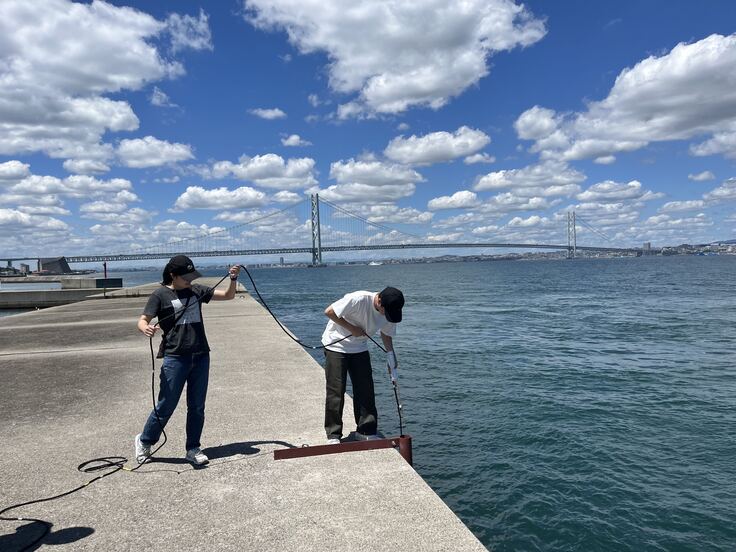 今日は、淡路島に水中マイクを設置してきました。写真の通り天気も良く、神戸と淡路島を結ぶ明石海峡大橋をバックに無事調査をすることができました。スナメリの鳴き声、入っていますように!