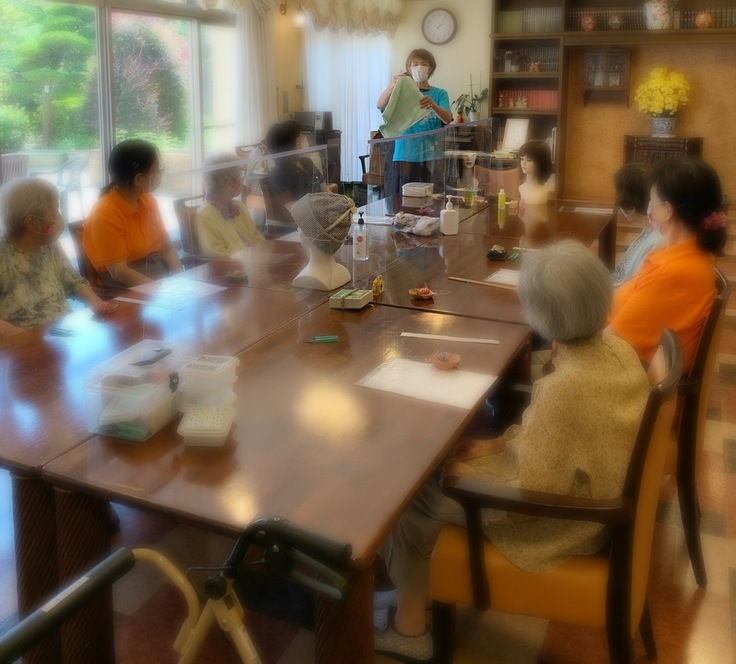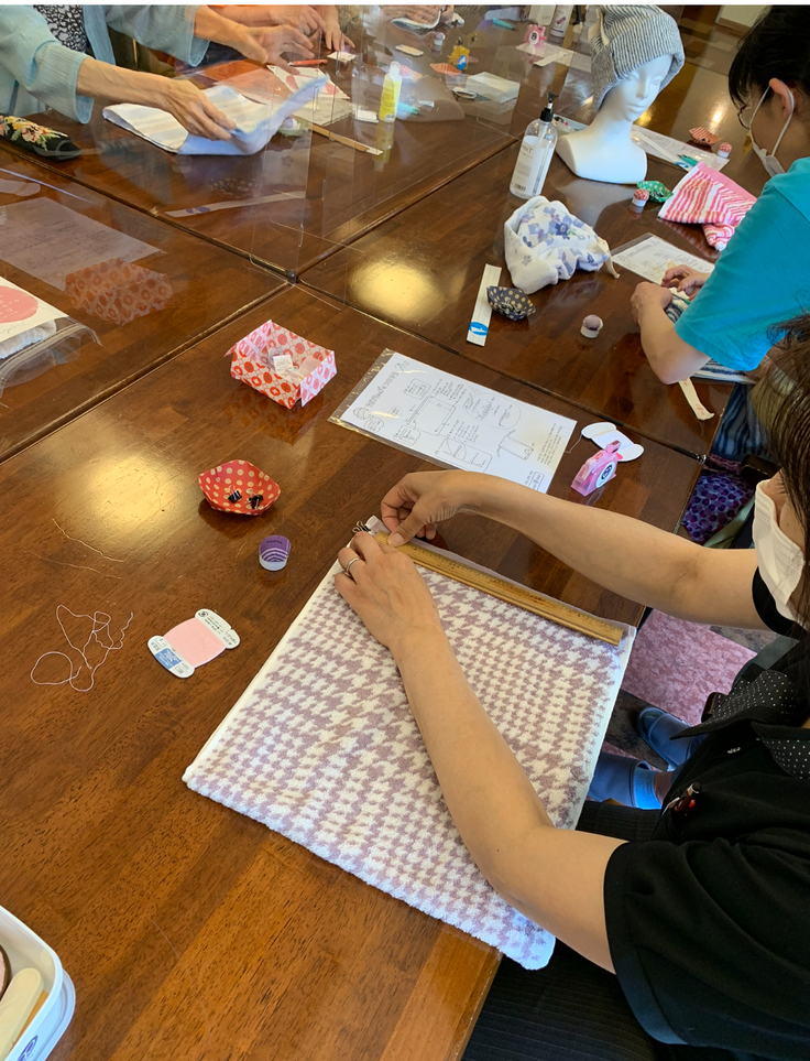 お店の定休日を使い、裁縫が得意な人やイベントに関心のある人に声をかけ、5〜6名が集まり、タオルで作る手縫いのケア帽子製作を始めました。