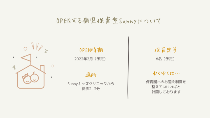 病児保育室Sunnyを作ります。そして利用してくださるお子様やご家族がいて、