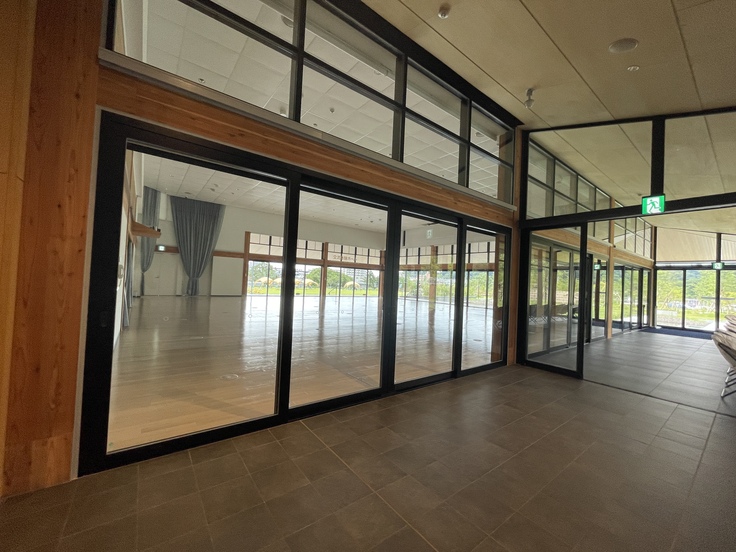 今回の上演会場は、劇場やホールではなく、2023年7月に開館した青葉山公園「仙臺緑彩館」という新しい公立施設です。「市民の憩いの場や観光客が楽しめる施設(HPより)」としてビジターセンターの役割を担う場所だそうです。会場となる交流体験ホールは3面をガラスに囲まれた、屋外からの光が差し込む開放的な空間です。大人数の会議や講演会、懇親会の開催などを想定して作られているような会場で、ここを会場にダンス公演を行うのはおそらく当団体が初となるでしょう。