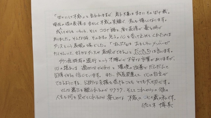 出演者の一人、ダンサーで演劇公演にも出演するアーティスト佐々木大喜の母であり、当団体の理事でもある佐々木博美さんから応援メッセージを頂きました。