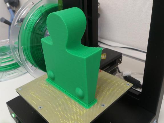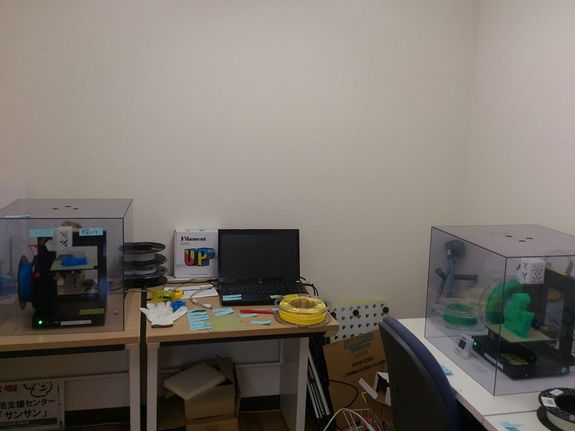 人の居ない就労室で2台で黙々と働いてくれた3DプリンタUP! Plusの御機嫌伺いからスタート。大型の造形も、関節的な設計の多い細かな造形も、無事、トラブルなしで生成完遂してました。UPくん、ご苦労様。安定しているときはいい子なんですが・・。さて、このグリーンの大型造形の出力で、READYFOR資金を使った15個の不便改善グッズをつくる活動での高松養護学校さんとの連携での完成品が、またひとつ誕生しました。