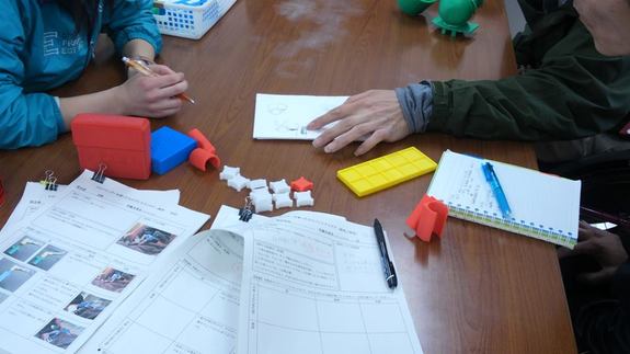 サンサン就労B型3Dプリンターチーム。READYFOR資金を使った15個の「不便改善グッズづくり」で連携している高松養護学校の小学部の先生が、打合せに来られました。試作品モデルを使っての感想や、"こんなふうなかたちになりませんか?”というやりとり。これが、難しい!複雑な形状になると、ちょっとしたニュアンスで、どっち向きに、どんな形がくっついていたらいいのか・・・4人で話していても、え?ああ。ええ?いや・・。という会話になりがち。絵を描いても、図面風にしても・・・ということで。