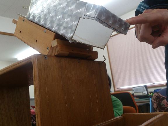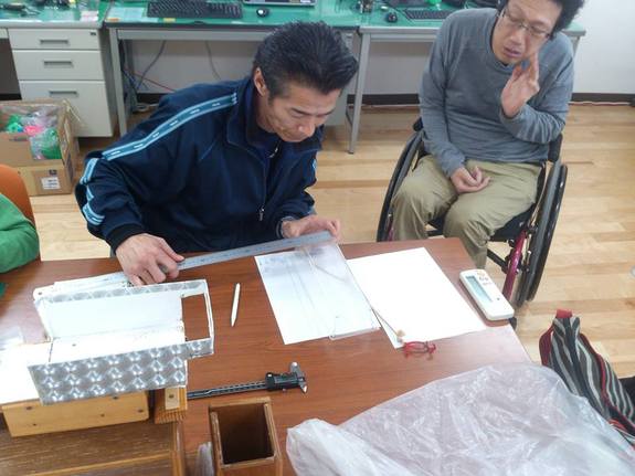 サンサンのご近所で同じくB型事業所のゴーゴースクラム様が来所。「こんなものが、3Dプリンターでつくれないか?」というご相談をいただきました。今使っている、木製の継ぎ足し装置の機能を残して、できるだけ一体型でできないか、という内容でした。