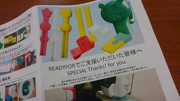 12月14日のプロジェクト成立後、約半年かかりましたが、皆様からの浄財を、有効に活用させていただきました。改めて、御礼を申し上げます。香川県立高松養護学校様は学校を挙げて協働してくださり、児童・生徒さんに毎日向き合っていらっしゃる先生方からたくさんのアイデア、そして試用しての改善要望をいただき、多くの不便改善グッズをつくることができました。重ねて御礼申し上げます。それでは、ご支援いただいた皆様、いましばらくお待ちください。