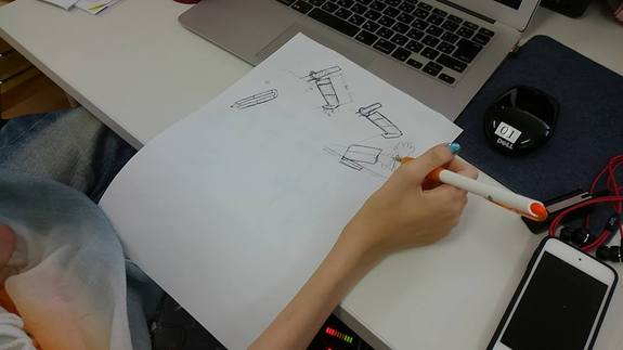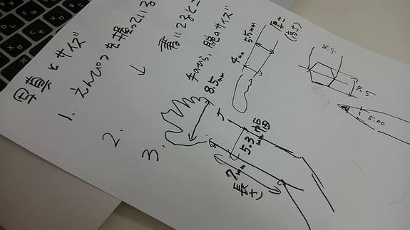 先日、新しく「こどもが鉛筆で字を書くときに手・腕が定まらないので、腕を固定するような補助具ができないか?」という相談いただきました。実際に鉛筆を使っているところの写真や、手のひら、腕のサイズを測っていただいたので、さあ、デザイン設計です。ベテラン松川さん。いよいよはじめて123Dデザインで「不便改善グッズ」の作図にチャレンジする藤川さん。金倉さんはiPadアプリ「123D Sculpt+」を使って『手書き絵の3Dデータ化』にチャレンジしています。