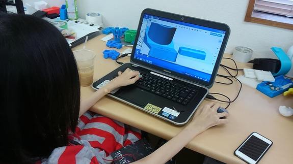 中さんが、先週から他のメンバーがスタートした「腕をゆるやかに固定」する補助具の3Dモデリングに入り、1時間もかけずに第一版の試作品データができて出力開始。もう一台の3Dプリンタでは、昨日、松川さんが仕上げたデータも出力しています。午後からは、藤川さんが高松養護さんとの連携の「水筒台」に、ご本人が希望している「クルマ」の造形を加える3Dモデリングに初挑戦!