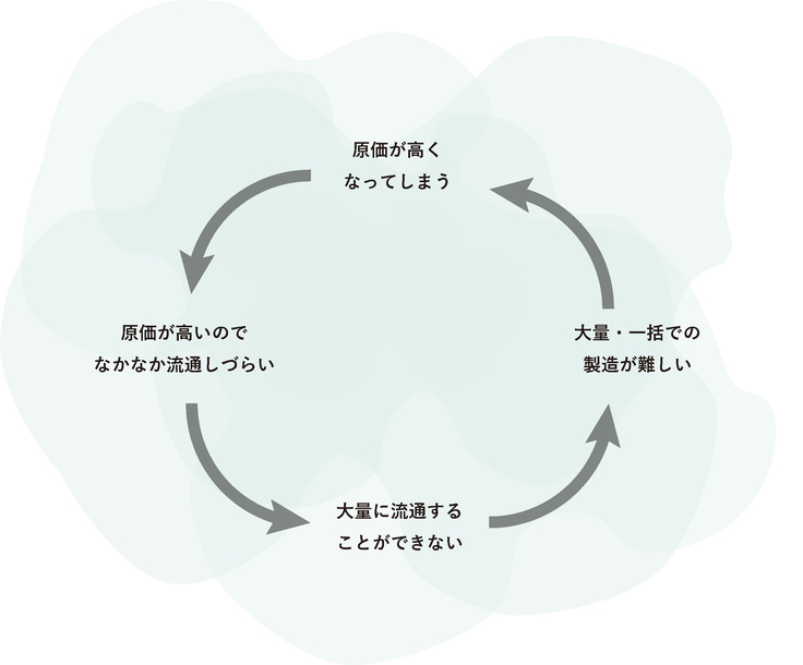 という悪循環に陥ってしまいます。こうした悪循環は環境配慮の素材に限ったことではないかもしれませんが、日本のマーケットでは新たなチャレンジが非常にしづらい背景があります。