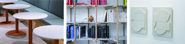 The Good Plastic Company という会社が、オランダをメインにヨーロッパの各拠点で生産しています。プラスチックのチップを細かく粉砕・圧縮して製造され、家具や什器の天板に使えるほど強度があり、見た目はテラゾー(小さな石粒をセメントや樹脂に混ぜて仕上げるもの)や大理石のようにも見えます。